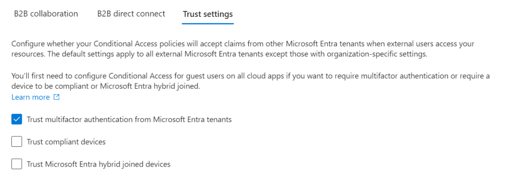 Deze instelling maak je in de Cross-tenant access settings en onder de tab Trust settings, zie de afbeelding hieronder. - Voor andere externe gebruikers (zonder Microsoft Entra account): Deze gebruikers moeten een gastaccount krijgen in jouw tenant om toegang te krijgen.